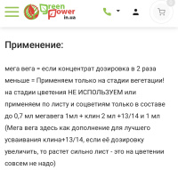 We apply only at the stage of vegetation! at the flowering stage DO NOT USE or use on the leaf and inflorescences only in the composition up to 0.7 ml Megavega 1ml + wedge 2 ml +13/14 and 1 ml increase, then the leaf grows strongly - this is not necessary at all during flowering)
